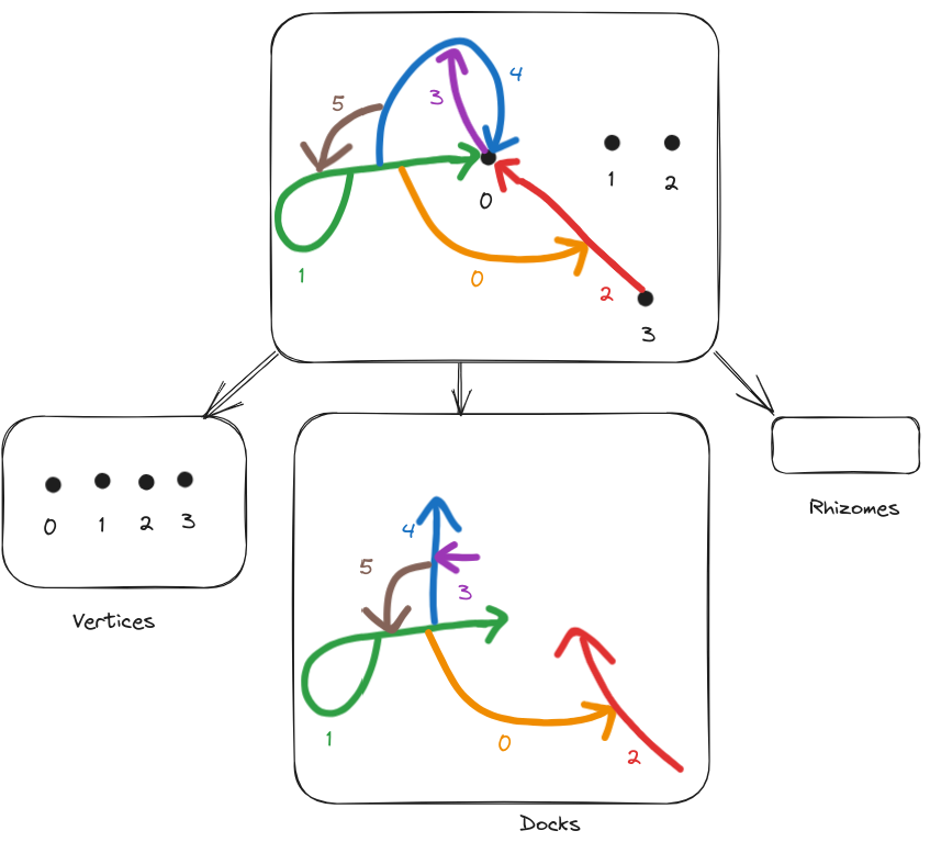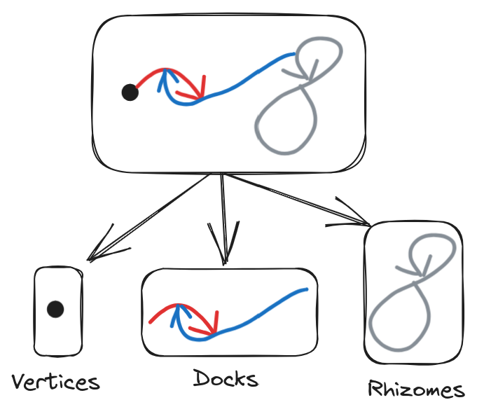 Intuition 6: A dock is basically a "structured multi-edge", that is it is connected, and has incoming and outgoing edges. A dock is the thing that connects rhizomes and vertices with other rhizomes and vertices.